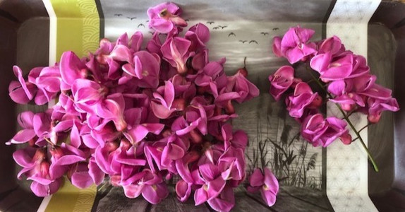 Depuis ma découverte de la cuisine des fleurs d'acacia, je me rends compte que je fais un peu plus attention aux arbres en faisant du vélo. Et que vois-je, à 500m de la maison? Un acacia rose, dont les fleurs sont aussi comestible !