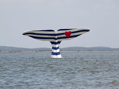 A l'est de la jetée, on peut observer une bouée en forme de queue de baleine, une sculpture emblématique d'Arcachon. La sculpture change de couleur tous les ans. C'est l'oeuvre du sculpteur Emmanuel Janssens Casteels. Cet artiste a créé une sculpture grandeur nature en 2011. Elle fait 9 mètres d'envergure. Depuis, tous les ans, il rénove sa sculpture après hibernation (la structure est sortie de l'eau en hiver pour la préserver de la corrosion), et l'habille de nouvelles couleurs. Et tous les ans, au printemps, sa nouvelle parure est dévoilée au public, pour notre plus grand bonheur ! En 2024, elle est aux couleurs des JO, 👍 j'adore !! Ci-dessous, quelques photos des parures des années passées.