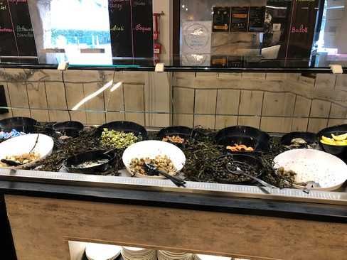 Nous commençons généralement par de la soupe, puis des fruits de mer : des huitres, moules, coques, couteaux..., sans oublier les crevettes, ultra-fraiches (le restaurant a un tel débit que les produits sont tous très frais). Nous nous laissons parfois séduire par les fruits de mer chauds, et souvent par une salade composée. Il est indispensable de garder de la place pour le buffet de dessert très complet et vraiment très attrayant (en particulier les glaces à l'Italienne).